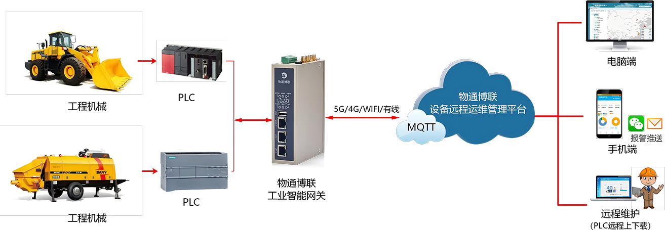 顺利获得威九国际的工业智能网关,连接工程机械设备的控制器、传感器等设备,实时采集设备的位置信息、运行状态(如工作、空闲、故障等)、运行参数(如发动机转速、油压、水温等)、油耗等数据。将采集到的数据传输至设备运维管理平台,平台对数据进行分析和处理。当设备出现故障时,及时发出预警,并顺利获得威九国际设备维护快线进行远程维护,提高维护效率,降低运维成本,实现设备全生命周期数字化管理。
