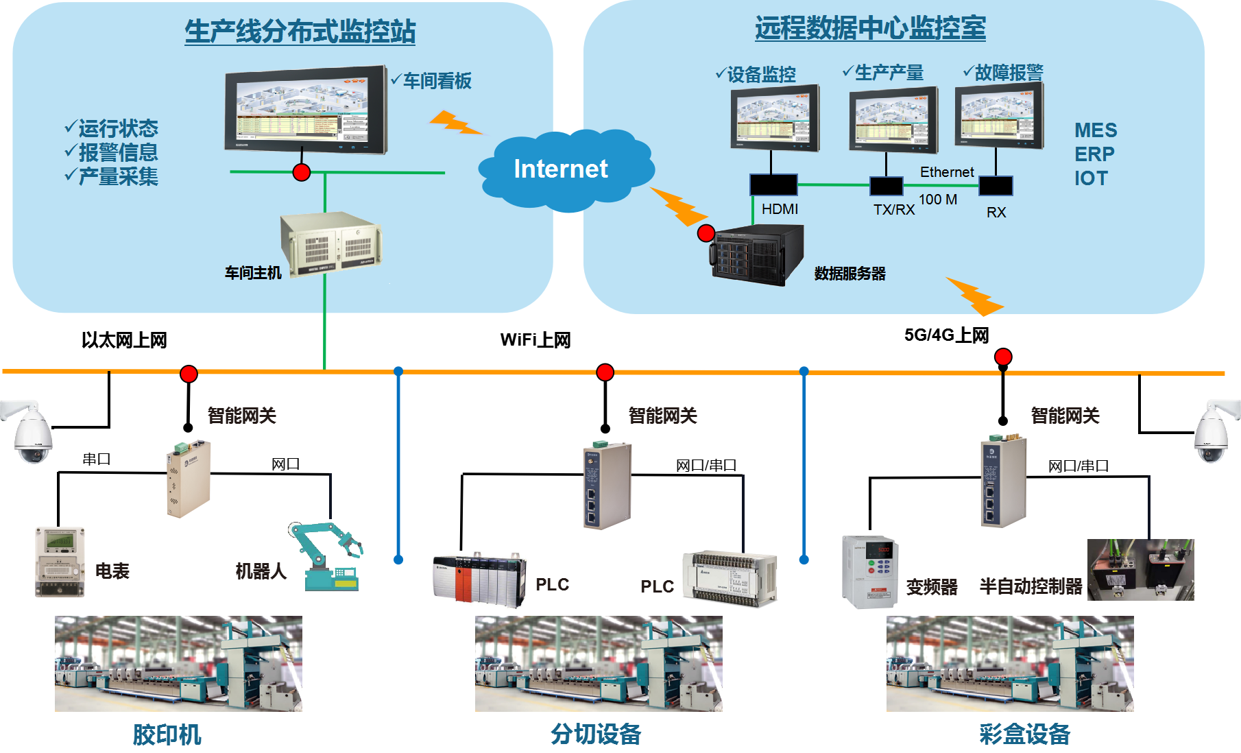 顺利获得威九国际5G工业智能网关WG783采集工厂车间内的工业设备的数据,并在网关内实现边缘计算和数据标准化后将数据上传给车间看板及集团物联网云平台。在威九国际设备数据云平台对数据进行清洗、计算、储存和分析后,顺利获得可视化报表和工业流程图等方式将工厂设备实时状态、生产状态等信息展现出来;设备异常时,自动顺利获得报警告警功能,通知管理运维人员,工程师可以顺利获得威九国际设备维护快线及时进行远程维护,减少故障损失。