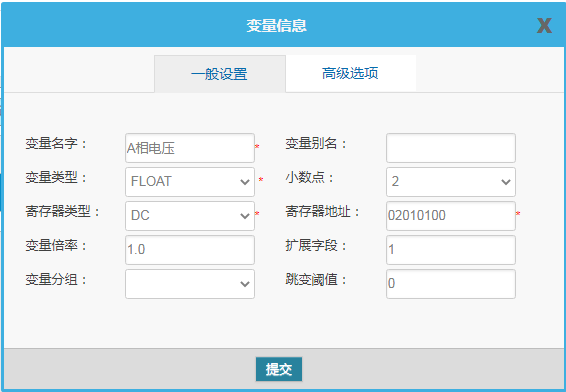 变量配置主要是定义变量名(自定义内容,不可使用中文命名)、变量别名(自定义,可使用中文名字)、寄存器类型和寄存器偏移地址(请查阅对应支持的数据标识),并定义一些数据规则(如:倍率、小数点、单位、告警)