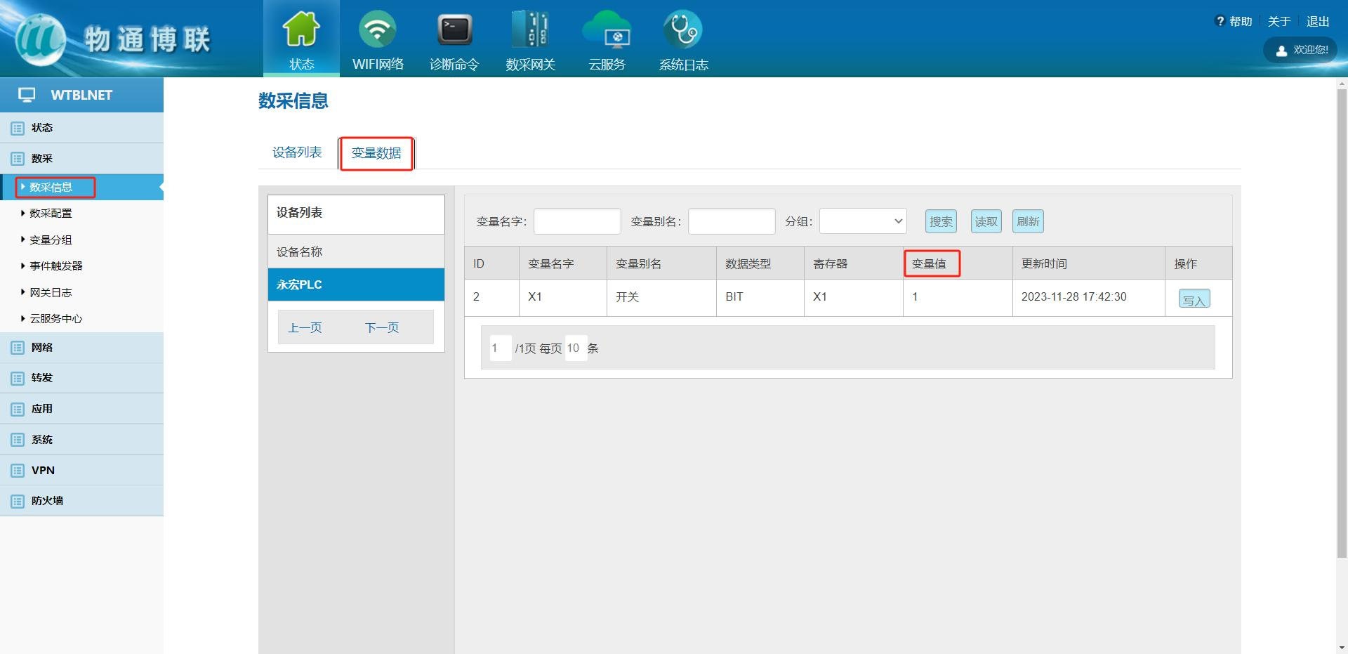 等待右下角弹出成功提示框后,点击“数采信息”->“变量数据”,即可在“变量值”一列查看采集结果。