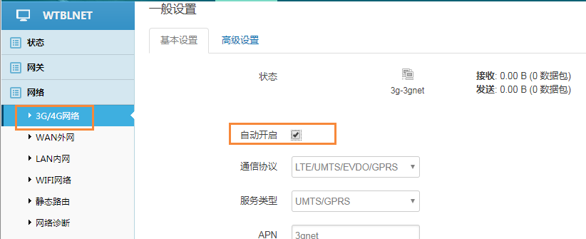 路径:网络---3G/4G----自动开启---保存并启用。