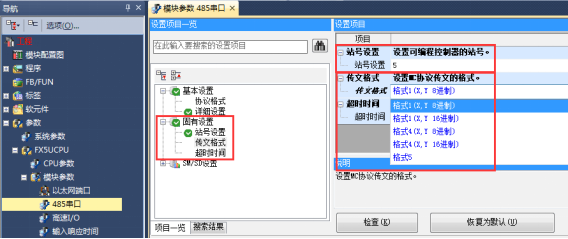 1、打开MELSOFTGXWorks3,登录FX5UPLC,设置FX5U网口参数,点击“参数”——“FX5UCPU”——“模块参数”——“485串口”,具体设置见下图: