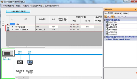3、打开后,会显示“以太网配置(内置以太网端口)”对话框,选择“SLMP连接设置”拖动至左侧,设置协议为“TCP”,端口号“1025”,详细设置见下图,设置完成后,点击“反映设置并关闭”。