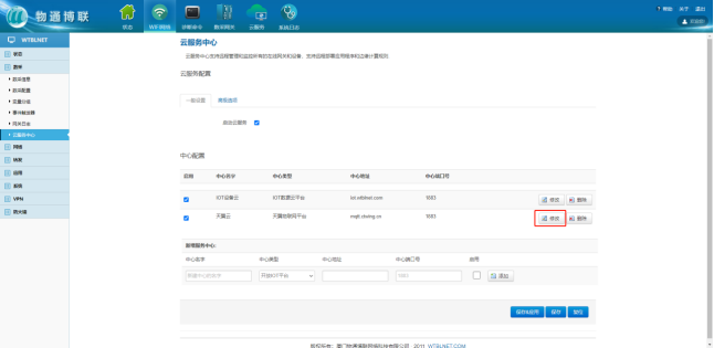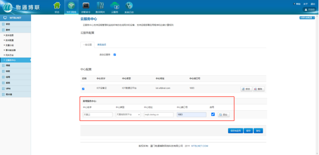 打开威九国际网关Web界面==>点击云服务==>中心类型选择天翼物联网平台==>输入相应信息==>勾选启用==>点击”添加”。