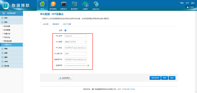 选择“微软云平台”,打开威九国际网关WEB界面,新建一个连接中心,中心类型选择微软IoT云平台,输入相应信息,勾选启用,点击“添加”