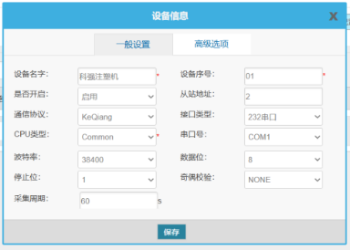 输入设备名称(任意),设备序号(任意,注意同一网关下的设备序号不能重复),从站地址(设备站号),通信协议(KeQiang,根据注塑机型号选择),接口类型(232串口),串口号(连接网关端串口号),以及串口参数(一般注塑机默认波特率是38400,数据位8,无校验,停止位1),采集周期根据自身需求设置,然后点击保存。