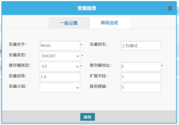 填写点位相关信息,变量名(任意),变量别名(任意),变量类型(根据点位数据类型选择,具体可查看网关支持的数据类型),寄存器类型(固定选择RT)以及寄存器地址(按照注塑机点位表填写,例如工作模式对应寄存器地址0),然后点击保存。
