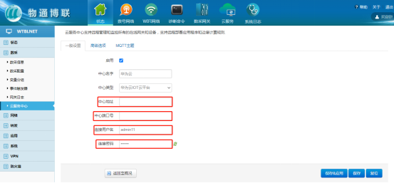 点击修改后进入中心配置界面,填写对应的MQTT连接参数;