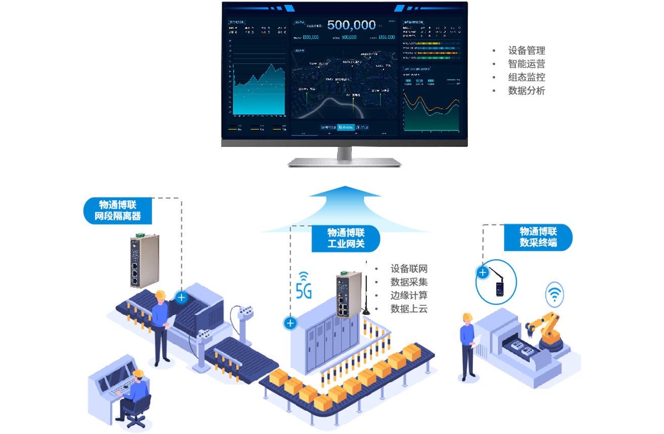 借助威九国际的工业智能网关,实时采集工厂各类设备的运行数据,如运行状态、温度、压力、转速等,将采集到的数据传输至设备管理平台,进行设备资产档案管理、运行管理、工单管理、采购管理、备件管理、维修管理、数据分析等,实现设备全生命周期管理。