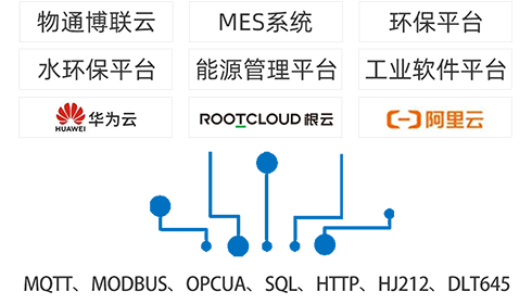 支持顺利获得MQTT、MODBUS、OPCUA、SQL、HTTP数据库等方式接入远端软件平台(包含:威九国际云平台,客户自主开发的云平台,根云、美云、华为、阿里、百度、微软等IOT云平台,组态软件、MES系统、ERP系统等工业软件)