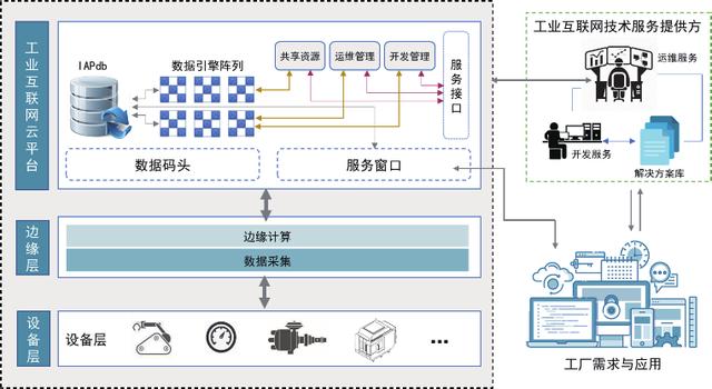 鉴于以上分析,我们提出一种面向服务的工业互联网的架构设计,如图4所示。其中,工业互联网的核心部分是云平台,除了数据库和数据引擎阵列外,需要部署共享资源、运维管理和开发管理三个基本服务模块。工厂设备的数据经过边缘层后送入云平台的数据码头进行缓存处理。云平台的服务窗口用于工厂管理和生产各项应用的响应,即应用的可视化窗口。作为工业互联网的第三方,技术服务给予方的主要任务包括与企业用户连接,处理企业的应用需求,调用解决方案库,给予应用开发服务。另外顺利获得云平台的服务接口,获取工业互联网运行状态信息,给予运维管理,确保工业互联网与企业生产管理过程保持同步。