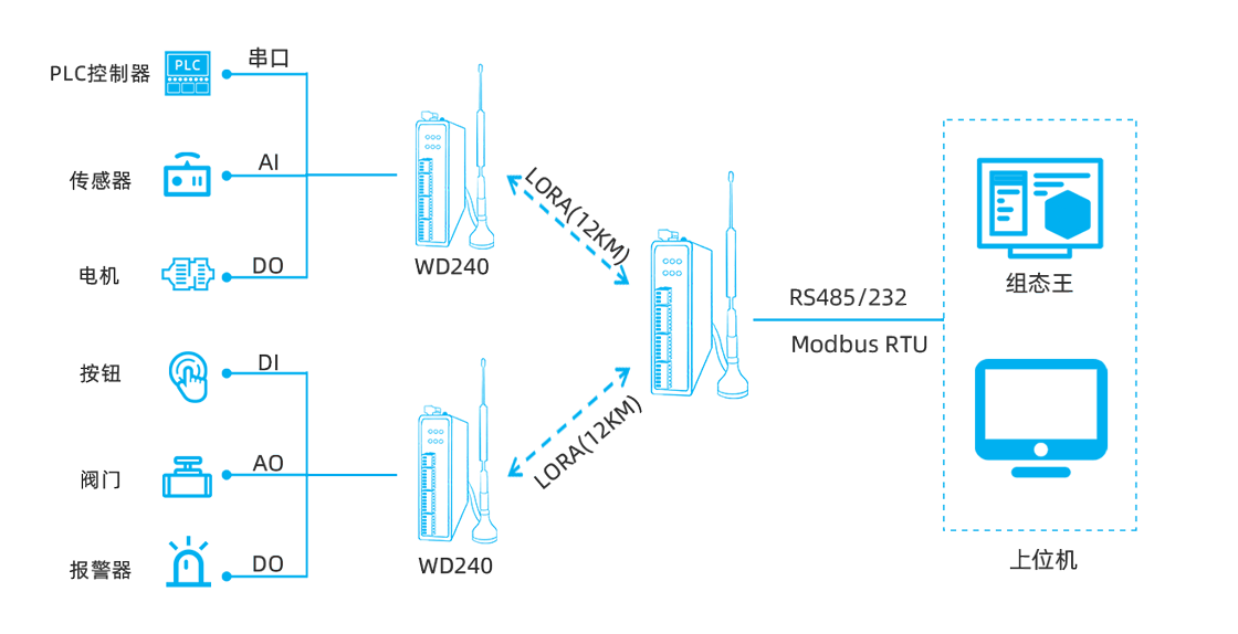示例 | WD240-LM0844-485(8AI-4DI-4DO,国内频段:410~493MHz,485串口) WD240-LM0484-232(4DI-4AI-4DI-4RO,国内频段:410~493MHz,232串口) WD240-LM0448-485(4DO-4AI-4DI-4RO,国内频段:410~493MHz,485串口) WD240-LM2644-232(2AO-6AI-4DI-4RO,国内频段:410~493MHz,232串口) WD240-LM0844-485(8AI-4DI-4DO,海外频段:850~930MHz,485串口) WD240-GM0844-485(8AI-4DI-4DO,4G CAT1,485串口)等 |