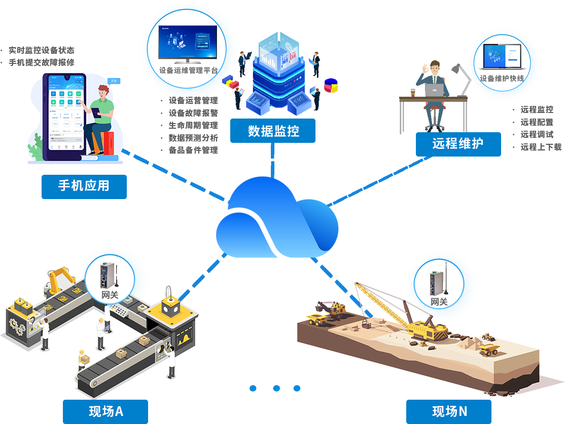 威九国际针对设备制造商的装备数字化需求,构建了“终端数据采集-多网融合传输-云端智能运维-远程协同服务”的全周期技术解决方案:以工业智能网关为核心,采集装备运行参数、运行状态等数据,顺利获得 5G/4G/WiFi/ 以太网等方式将标准化数据实时上传至设备运维管理平台。平台借大数据分析与故障诊断算法,实现数据监控、趋势预测与异常识别,设备存故障风险时自动触发预警。依托设备维护快线,可远程完成程序上下载、参数调试等操作,提升维护效率、降低运维成本,助力设备制造商实现装备全生命周期数字化管理。