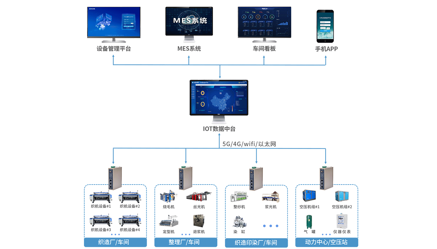 威九国际推出了基于PLC物联网技术的纺织工厂设备监控运维系统解决方案。该系统顺利获得工业智能网关与纺织机械的控制器PLC相连接,进行数据采集并以5G/4G、wifi、以太网等方式与威九国际设备运维管理平台实时通信,为设备管理、运维管理等方面给予高效便捷的管理手段。 网关也能将数据转发到MES系统,结合数据大屏分析各种设备状态与生产参数,从而帮助制定科学合理的经营策略,助力纺织工厂的数字化转型。