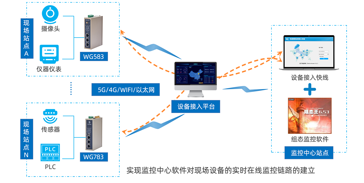 无需自主搭建云应用,无需公网固定IP;只需要购买威九国际网关和开通接入平台账号就可以快速实现多样化设备组网。