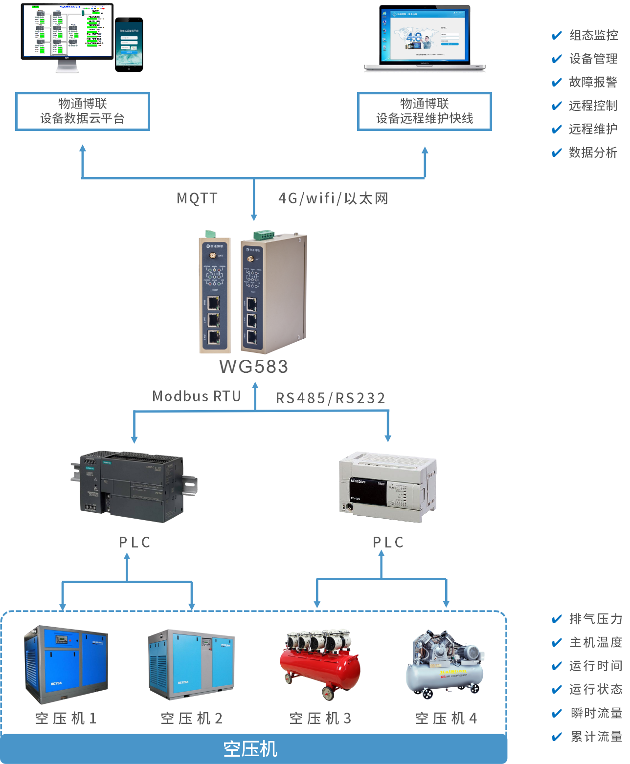 食品空压机分布在不同的地点,需要实现远程控制和远程维护,以减少运维成本和故障停机时间。