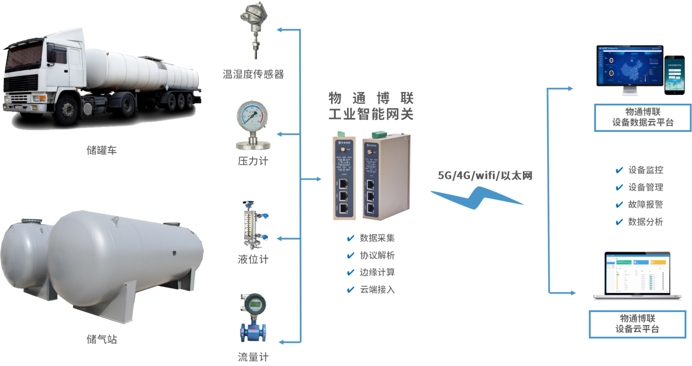 网关可以采集温度传感器、压力计、液位计、流量计等设备的数据,如液位、压力、温度、流量等数据,实现对槽罐车、储罐、储箱等设备的在线监测。