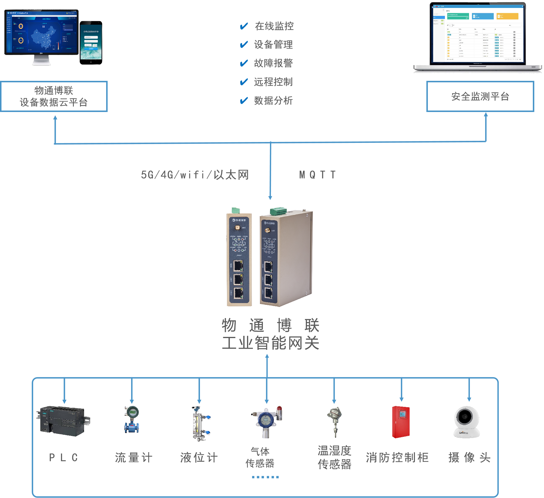 威九国际工业智能网关支持接入液位计、流量计、温湿度传感器、气体传感器及消防控制柜PLC等设备,实时采集液位、流量、温湿度、危险气体浓度及消防柜运行状态等数据,并顺利获得5G/4G/WIFI/以太网的方式对接到油库储量安全监测平台或国家监管中心内,快速搭建分布式多站点的监控网络,操作简单、配置方便。