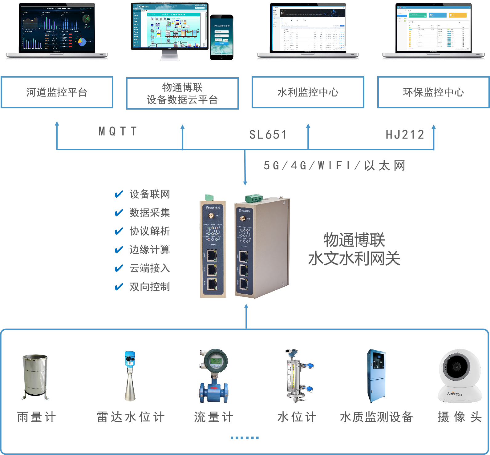 网关可以接入流量计、流速仪、雨量计、水位计、水质监测仪、摄像头等设备,进行实时数据采集并给予5G/4G/WIFI/以太网等通信方式,实现全天候7*24小时自动化工作。