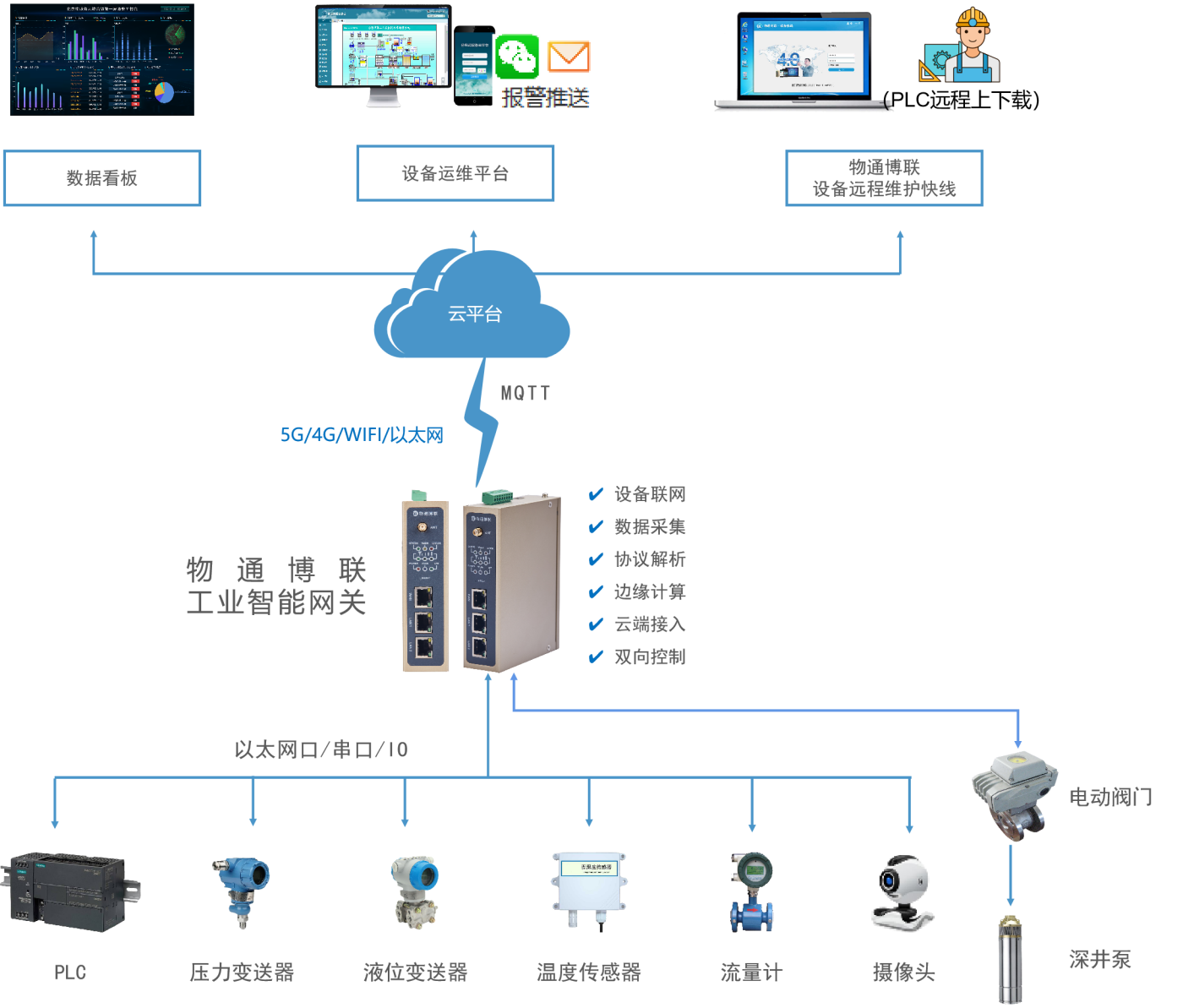 威九国际工业智能网关部署在泵站现场,具备强大的协议解析能力,能够无缝对接泵站中的PLC、压力变送器、温度传感器、液位变送器、流量计、摄像头等设备,实时采集并精准解析其运行状态和数据,并将数据上传到云平台进行监控。