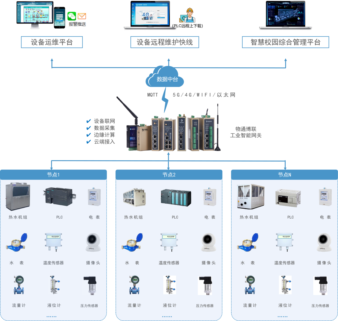 现场控制器PLC汇集温度传感器、液位传感器、溢流开关、电磁阀、水表、空气能设备、电表、变频器、水泵、继电器等设备,对这些设备进行逻辑控制,威九国际工业智能网关顺利获得以太网/串口方式从现场设备采集设备的各项数据(设备运行状态、温度、液位、出水压力、耗电量、制热量)等信息,利用边缘计算能力对数据进行处理从而完成数据标准化,然后顺利获得4G网络把数据上传威九国际数据中台,威九国际数据中台将数据转发到设备远程监控管理系统,实时监控热水机站状态,支持对热水机组进行远程控制,实现不同时段、不同天气温合理调节机站运行状态、设置温度,支持故障报警,告警异常及时通知到运维人员,提前发现及时处理,提升服务质量,预防事故发生,降低运营成本,达到节能减排目的;同时威九国际数据中台将数据接入到智慧校园综合管理平台和校园一卡通系统,方便学生和教职工使用,提高学校管理效率。