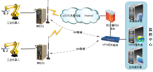 监控中心端采用ADSL/光纤接入Internet 公网,获取固定公网ip。搭建vpn服务器。威九国际工业无线路由WR515做vpn客户端和服务器建立vpn隧道,实现两端内网互通。数据库服务器上运行采集系统,可以采集工业无线路由WR515下接的以太网plc数据以及工业机器人数据,从而达到采集监控工业机器人运行状态目的。