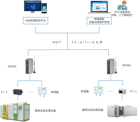 威九国际工业智能网关WG583与餐厨垃圾处理设备进行通讯,可以将设备的运行状态、工作参数等数据采集到网关上,进行解析并上报到云端。