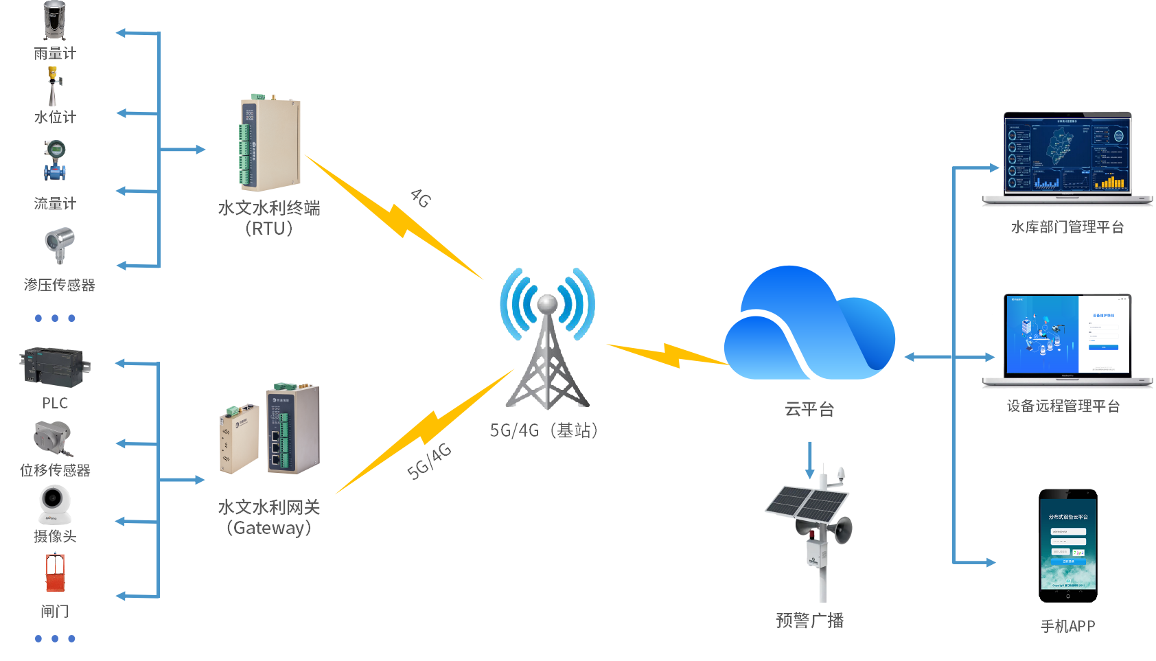 水文水利网关可以接入流量计、温湿度传感器、雨量计、液位计等设备,采集到流量、流速、水位、水深、温度、湿度、水压等数据并顺利获得5G/4G等方式上网,将数据顺利获得传输到云服务器,进而在云平台或手机端远程监控,也能将数据转发到水利部门平台,实现数据共享与多方监管。