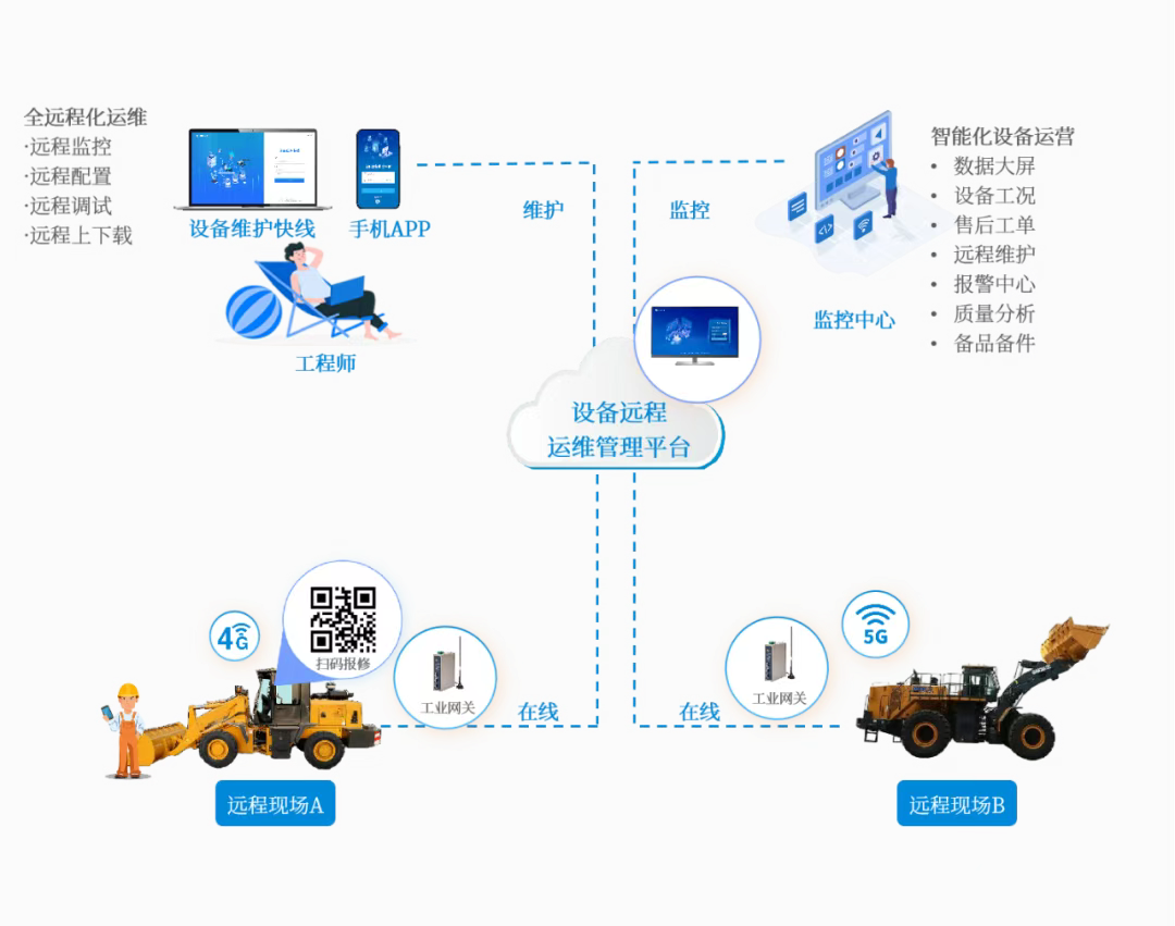装载机往往单机运行、缺少联网,设备制造商无法实时获取设备位置分布、运行状态、告警信息等,导致故障发现滞后,无法快速响应,导致客户体验不佳,影响企业形象与口碑。
